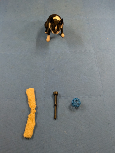 Start with the least-favorite of the three toys. Put the other two someplace you can reach them, but the dog can’t. Slap that toy on the floor and slowly wave it back and forth to get your dog to play tug with you.