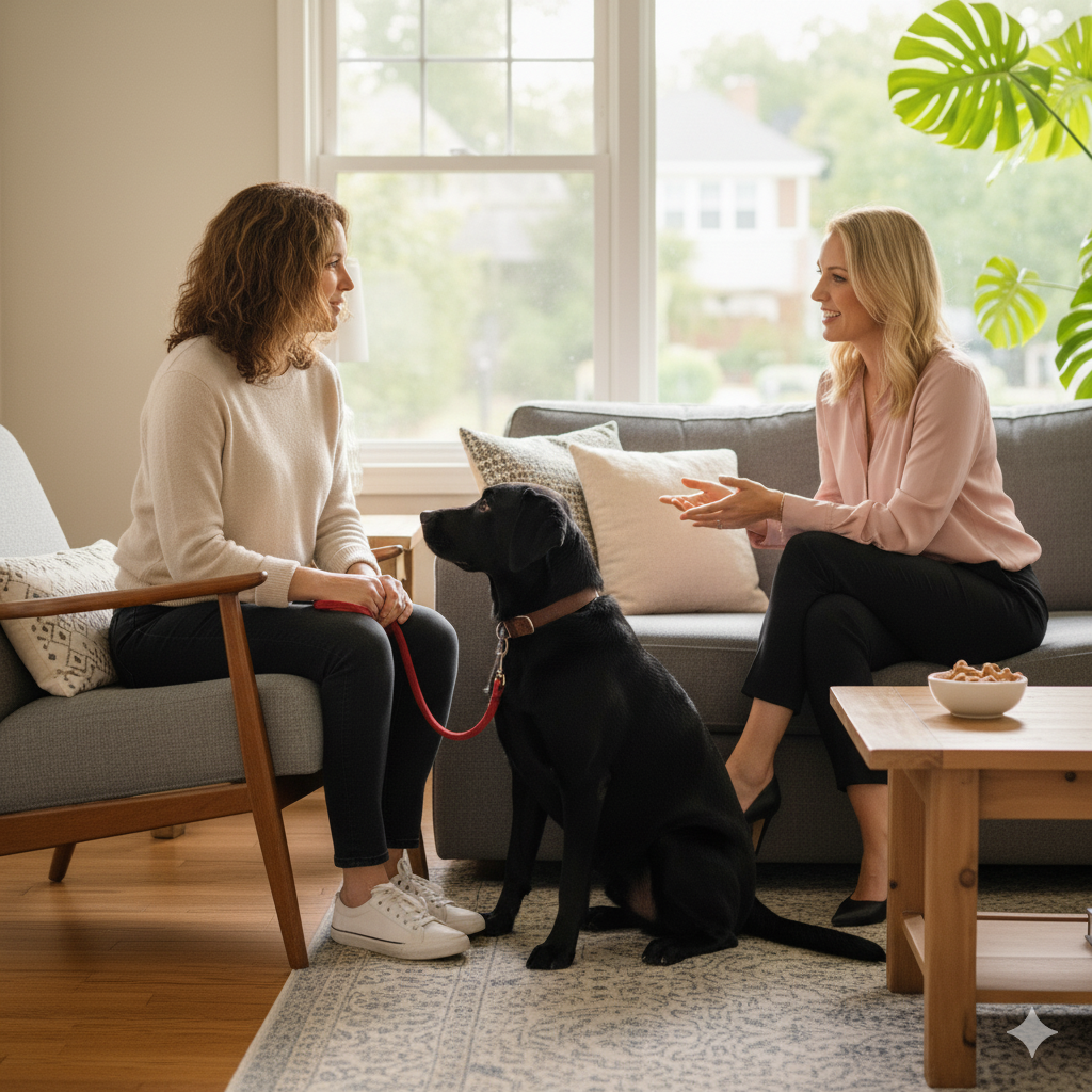 She’ll achieve this by building her dog’s army of “Cookie People,” both in her neighborhood and at home. She can enlist friends and neighbors to come over specifically for short dog-training sessions. It only takes a few minutes and does the dog a world of good to meet new people at home in a non-threatening way.