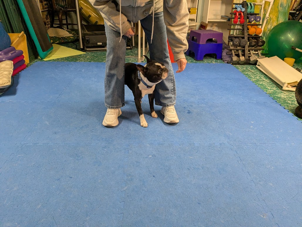 Have treats in both hands. Stand in front of your dog with your legs apart. The object of the game is for your dog to go between your legs, circle one leg, then the other. It creates a “figure 8” pattern, or an infinity symbol.